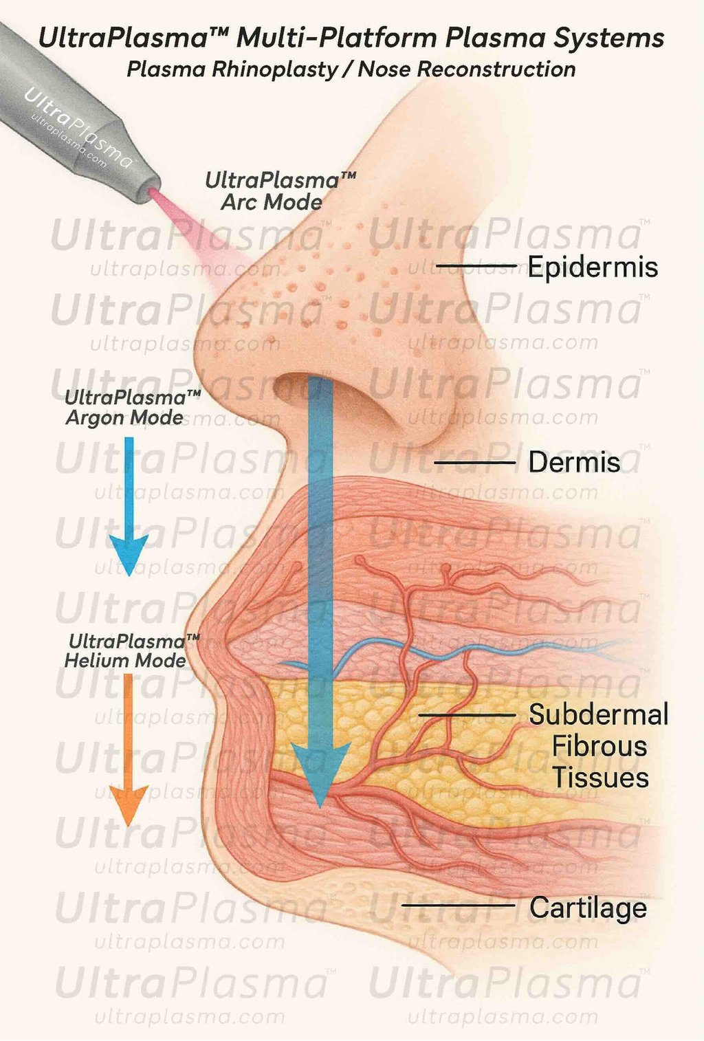 • UltraPlasma™ Arc Plasma Mode: High-energy surface ablation and collagen contraction in the upper dermis.