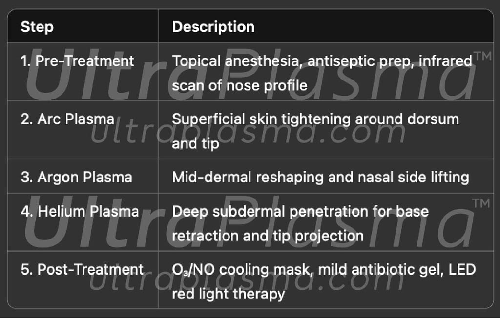 Plasma rhinoplasty using UltraPlasma™ multi-platform plasma systems provides a novel, effective, and safe alternative to surgical nose reshaping. The synergy of arc, argon, and helium plasma allows for multi-layered tissue remodeling, aided by ozone and NO-driven biological enhancement. This technique offers a reproducible, outpatient solution for nasal lifting, tip projection, and dorsum refinement with minimal downtime.